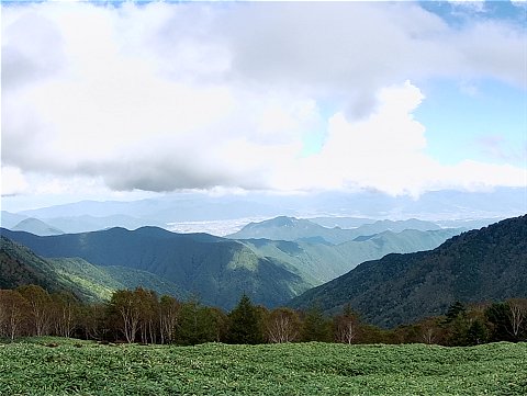 | 斑尾高原付近からの秋景色:奥に見えるとんがり山は槍ヶ岳? |